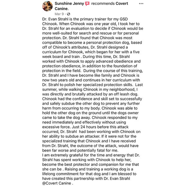 Our head trainer Dr. Evan Strahl is a graduate of Primal Canine University. He has a long history competing with working dogs at the national level in multiple dog sports and working with police departments helping to create the ideal working dog. Now most of his time is spent training difficult cases of pet dogs for the general public and still competing with his own dogs. Learn more about Dr. Evan.